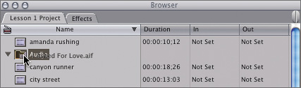 NOTE Whenever you drag and drop an item in Final Cut Pro, make sure the tip of the Selection tool pointer touches the target destination, in this case the bin icon or name.