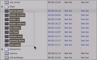 NOTE Dragging diagonally to select clips is often referred to as marqueeing, as in "drag a marquee around these clips." | 6. | Select the group of four clips on the bottom of the list, then hold down the Command key and click each of the remaining clips once to add them to the current selection. Drag them as a group into the Clips bin.