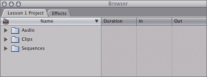 | 2. | Click the disclosure triangle next to the Audio bin to hide the contents of that bin. Hide the contents of the Sequences bin.