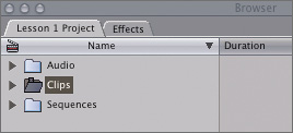| 9. | Now display the contents of the Clips bin by clicking the disclosure triangle next to it.