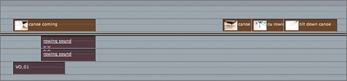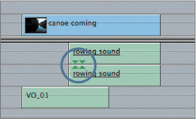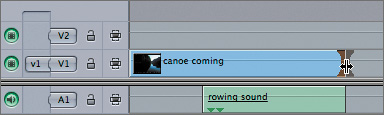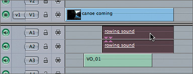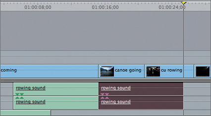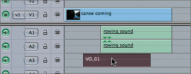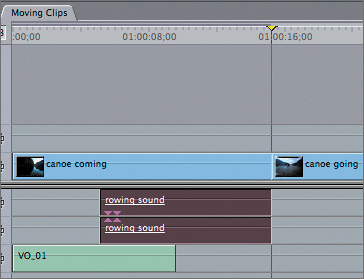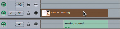 NOTE Snapping is a magnet-like function that allows you to easily align clips to each other, or to the playhead location. Snapping is discussed in more detail later in this lesson. | 11. | Drag the rowing sound clip, and snap its Out point to the Out point of the canoe coming clip. Play these three clips to see if you like the new placement of the voice-over.