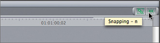 | TIP You can always drag a clip back into the Viewer if you change your mind about using it in the sequence. Snapping to the Playhead When you made Overwrite and Insert edits in the previous lesson, you moved the playhead in the Timeline to where you wanted to place the new clip. This is not required when you drag a clip into the Timeline. You can place a new clip wherever you choose to drop it, regardless of the playhead position. However, a clip will snap to the playhead when you move past it as long as snapping is active. Using the snapping function to snap a clip to the playhead will ensure that you position your clip exactly where you want. The Snapping button is located in the upper-right corner of the Timeline button bar and can be toggled off or on any time during the editing process.  NOTE Every window has its own button bar that you can customize with a unique set of functions, tools, or commands. The two default functions that appear in the Timeline window are snapping and linked selection. You will learn to customize these button bars in a later lesson. 1. | In the Timeline, click the Snapping button several times.