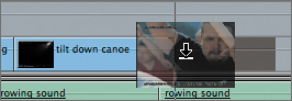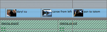 NOTE This footage was originally shot on super 35mm film and transferred to tape. You may see some film artifacts, such as frame duplication, in this clip. | 9. | Drag the daryl slo-mo clip to the V1 track, and insert it after the canoe from left clip.