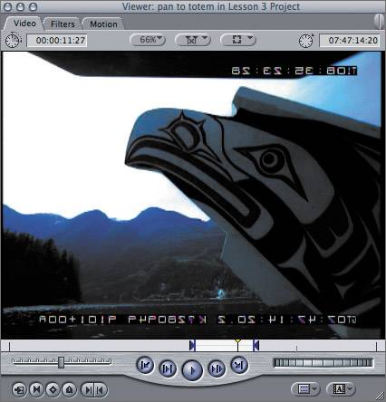 If you look closely at the visual timecode and film key frame numbers in the image portion of this clip, you will see that they are reversed. In order for these two clips to match direction, the pan to totem clip had to be flopped or turned around to face the opposite direction. Also, the black area at the top of the image is a shade attached to the camera. Because the final version of this film screens as a widescreen format, the black area won't show. You will learn to flop clips and add mattes in a later lesson.