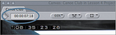 | 3. | Before you remove these marks, which you will do in the next step, look closely at the duration of the marked clip in the Canvas Timecode Duration field. It is 7:18.