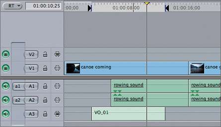 | In the previous exercise, you positioned the playhead over a video clip and pressed X to find its duration. But what if your producer turns to you and says, "How long is the VO_01 narration clip?" To find a specific point, you need a vertical and horizontal reference. The playhead provides the vertical reference point in the Timeline, and you can use a track selection control to identify the specific track, or horizontal reference. 1. | Move the playhead over the middle of the canoe coming clip, and press X.