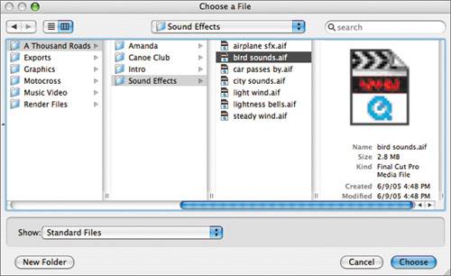| 2. | When the Choose A File window opens, navigate to the FCP5 Book Files > Media > A Thousand Roads > Sound Effects folder. Click the bird sounds.aif clip once to select it.