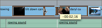 In this sequence, each clip begins with a downward rowing stroke. This was one way to maintain sync with the other video clips and the rowing sound effects. But let's say you want to give the daryl cu clip an extra stroke at the head of the clip without changing the sequence length or upsetting the sync between the clips.