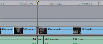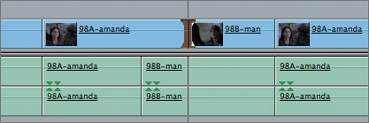 | 8. | Move the playhead toward the end of the previous 98B-man clip, and select the edit point between this and the 98A-amanda clip. This time use the Extend Edit shortcut key, E, to extend the edit point to the playhead location.