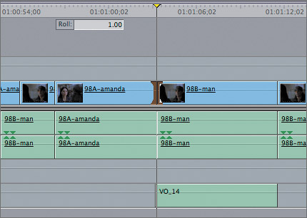 TIP Pressing the Shift key with the Roll tool on the pointer will temporarily change the pointer to the Ripple tool. Then you can make a change on both edit points at the same time (Roll tool) or just one edit point (Ripple). | 6. | Play the last 98A-amanda clip in this sequence.