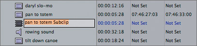 | TIP After you edit a subclip into a sequence, you cannot lengthen the subclip. You can, however, remove the subclip restrictions you placed on it by selecting the sequence clip and choosing Modify > Remove Subclip Limits. This reverts the clip back to the original clip length but retains the subclip name. Project Practice You can continue to practice making subclips by finding the following areas in the pan to totem master clip, marking them, and creating subclips: NOTE It's okay if one subclip overlaps another. They will each be individual clips. |