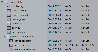 | When you capture source material, which you will do in Lesson 9, you determine the duration of each clip. You might start and stop your tape and capture several short clips, or you might let the tape run and capture longer clips. During editing, if it's a challenge to find what you're looking for in a longer clip, you can create shorter subclips of just the sections you want to edit. Making a subclip begins with setting In and Out points on a clip in the Viewer to identify the material you want to use. 1. | In the Browser, reveal the contents of the Canoe Club bin, and double-click the pan to totem clip to open it in the Viewer. Drag the playhead through this clip to review it.