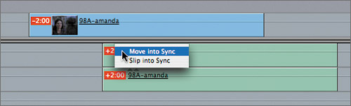NOTE You can choose to move either the video or audio portion of a clip that is out of sync. | 4. | To view another sync option, press Cmd-Z to return the tracks to their out-of-sync state. This time, Ctrl-click one of the out-of-sync indicators on the audio tracks and choose Slip Into Sync from the shortcut menu. Play the clip.