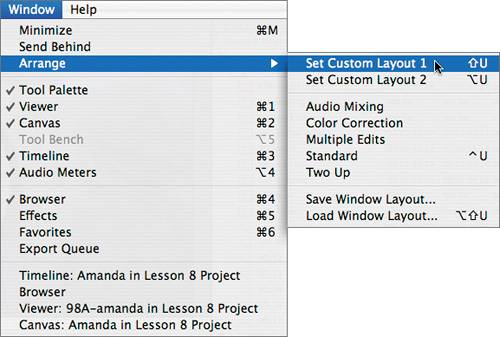 | Saving and Recalling Window Layouts If you prefer your own personal window layout over the Final Cut Pro preset window layouts, you can save these layouts and return to them at any time without having to create them again manually. You can also start with a preset layout, make changes to that, and then save the layout. Window layouts apply to all open projects. 1. | To save the existing layout, hold down the Option key and choose Window > Arrange > Set Custom Layout 1. Release the mouse and then release the Option key.
