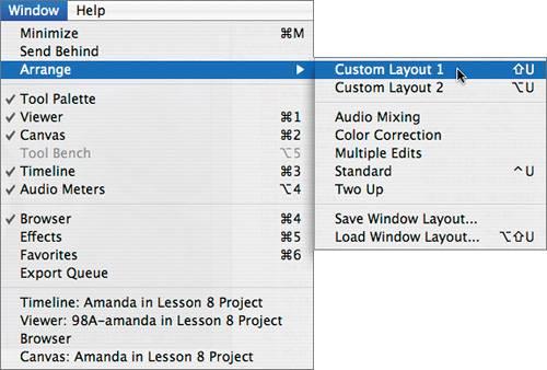 NOTE You can also choose Window > Arrange > Save Window Layout to save additional named layouts in your Final Cut Pro User Data folder. | 4. | To recall the first layout of the rearranged windows (Custom Layout 1), choose Window > Arrange > Custom Layout 1, or press Shift-U.