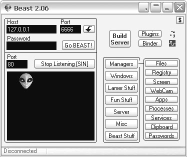 | This case study gives you an idea of how to penetrate a network that might ordinarily appear impenetrable. The steps given here are somewhat out of bounds for penetration testing, but if the contract is open to any possible penetration, view this case study as a novel idea and a workable possibility. This study also serves to generate a little anxiety over how a hacker can gain access to any system. If one way does not work, the hacker can try another way. Evil Jimmy has been tirelessly trying to get past a PIX firewall into Little Company Network (LCN). Finally, after exhausting scanning, web hacking, and endless SQL injection attacks to no avail, Jimmy resorts to a dark and evil path. He will send LCN a Trojan horse that can be installed on any computer and will come back through that tough PIX firewall and right to his home computer. Jimmy will take a brilliant and popular backdoor program called Beast (as covered previously in the chapter) and place it on a CD with autorun configured to execute it when someone puts the CD in his computer. Next, he will sit back and wait for someone to run the CD and allow the Trojan to become installed. The Trojan will contact Jimmy's hacking computer at his home. Step 1. | The first thing is to create the backdoor server with Beast. By clicking on the Build Server button, Jimmy selects explorer.exe, the program that Beast should inject itself into. This enables Beast to go undetected by most anti-virus software programs. (See Figure 12-69.)