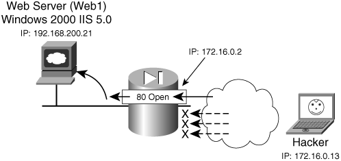 | This case study takes several of the tools and techniques discussed in the chapter and links them to a full-blown breach on an internal network. Evil Jimmy's exploits demonstrate that web servers should always be kept updated and patched. The Little Company Network has just rebuilt its web server in a DMZ that hosts http://www.hackmynetwork.com. It has configured the Cisco PIX Firewall to statically map port 80 from the Internet to the internal web server and blocked all other external access. The network administrators have been pressured by management and customers, so they have not been able to apply service packs or security features to the Windows 2000 IIS server yet. However, they believe that because the server is behind a firewall, attacks will be stopped and give them some safety before they get a chance later to install the service packs and properly lock down the server. Three days have passed, and their optimism is unfounded when Evil Jimmy gets his hands on the server. Figure 7-39 displays the network used in this case study. Figure 7-39. Sample Network  Well, Evil Jimmy is off to prove a point to his hacking buddies that he can hack an IIS 5.0 web server in less than five minutes. His first task is to find a nice easy target system. That is where http://www.hackmynetwork.com comes into play. He starts the clock at 23:47 PM. Step 1. | To start, Evil Jimmy port scans the http://www.hackmynetwork.com IP address using NMap to look for open ports. He uses the sT switch to guarantee that the ports are open and limits his port scanning range to the first 100 ports with the p switch to help avoid detection and the O to perform some OS guessing. The command and output returned are as follows: