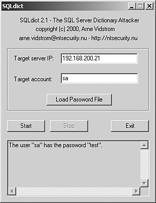 Figure 8-17. Successfully Obtaining the sa Password with SQLDict  Jimmy can now log in to the server, browse, and damage at will. However, he figures it would be more useful to get his hands on the actual data files.