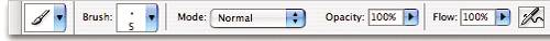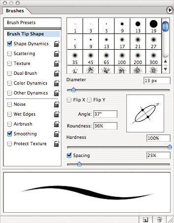| Painting with brushes is another way to create digital imagery from scratch, and Photoshop gives you amazing flexibility in its Brush tool. Basic Brush Settings You've got a few ways to view brushes in Photoshop. Let's start with the simplest view containing the fewest options. When you click the Brush tool in the toolbox, you'll notice that the Options bar changes to reflect the current tool's available settings. Figure 4.30. The Brush tool options.  By exploring these options, you'll find the most basic settings that can be applied to a brush: tip To change brush sizes quickly as you paint, press the left and right bracket keys. Press the [ key to reduce the brush size and the ] key to increase it. The increment of change depends on the brush size. A brush size between 0 and 100 pixels will change by 10-pixel increments each time you use this shortcut. A brush between 100 and 200 pixels will change by 25 pixels; a brush between 200 and 300 pixels will change by 50 pixels; and a brush between 300 and 2500 pixels will change by 100 pixels. Master Diameter This setting controls the size of the brush. Enter a value in pixels or drag the slider to change the setting. Hardness This setting controls the size of the brush's hard center, or crispness. It is expressed as a percentage of the total brush size. Setting the hardness to 100 percent means that the brush's hard center extends out to the full width of the brushthe edge will be crisp. At 50 percent, the center (50 percent) of the brush is hard and the remaining portion (50 percent) becomes softer toward the edge of the brush. Mode This setting controls how the current brush affects the pixels in your image, like the Blend Modes you've used in the Layers palette. Opacity This setting controls the opacity of the brush. At 100 percent, the brush will be applied at full opacity. Anything less, and you'll begin to see through the brushstrokes. Flow Flow determines how quickly the brush applies paint. A lower setting produces a lighter stroke. Airbrush The Airbrush button allows you to apply gradual tones to an image, simulating traditional airbrush techniques. Advanced Brushes Palette Here's where we get into the meat of Photoshop's powerful brush engine. The advanced Brushes palette contains the options for re-creating traditional media brushes as well as options that allow you to generate random textures and designs quickly. This is the palette in which you'll be spending most of your time when doing advanced painting in Photoshop. Starting from the top, let's work our way down the palette and see what each option can do for us. Brush Tip Shape You've already seen what the Diameter and Hardness settings can do. This view offers even more options regarding the tip of the brush. Angle and Roundness Angle specifies the angle at which the brush is applied to the canvas. Roundness specifies the elliptical shape of the brushfrom a perfect circle to a thin oval. Use these settings together to produce calligraphy-like effects with a round brush. Figure 4.31. With an Angle of 37 degrees and a Roundness of 36 percent, the brush is a narrow, slanted oval and will produce a calligraphic stroke.