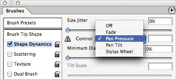 Spacing Spacing determines how closely the Brush tool spaces each brush mark. A small value produces very tight spaces between brush marks. A high setting makes the brush appear to skip as you paint. Shape Dynamics The Shape Dynamics section controls three aspects of the brush stroke appearance: size, rotation, and perspective. The variations for each parameter are specified with sliders. You'll see the word jitter used throughout the Brushes palette. Essentially, Adobe uses this term within certain brush settings to determine variation in the individual instances of the brush's tip. Think of it as the maximum range of allowable values. Jitter-based settings allow you to achieve random effects with brushes, as they produce different results each time. Scattering Scattering spreads copies of the brush tip's shape along the path of a stroke. Texture The Texture setting in the Brushes palette uses a pattern to make strokes appear as if they were painted on a textured canvas. Dual Brush The Dual Brush option adds another brush tip to the one selected as the Brush Tip Shape. The second tip is overlaid using the Blend Mode at the top of the Dual Brush section of the Brushes palette. This section is a cross between the Brush Tip Shape and Scattering sections. In addition to selecting the second brush tip and Blend Mode, you adjust the second tip for diameter, spacing, scattering, and count. Count refers to the number of times the second brush tip appears in each stroke of the initial brush tip. Color Dynamics The Color Dynamics section hosts more settings that really let you save time and randomize your brushes. Color Dynamics looks at the current foreground and background colors (set in the toolbox) and interprets colors between them based on the settings in this section. It then applies those colors randomly to each instance of the brush tip that is applied to the canvas. Other Dynamics Other Dynamics contains settings only for opacity jitter and flow jitter. These two settings operate just like the opacity and flow settings discussed earlier, but the added jitter lets you vary the application of them. The various Control drop-down menus let you specify how you'd like to control the variation of certain elements of brushes. You can choose not to control, fade, or vary a brush based on Pen Pressure, Pen Tilt, and so on. Figure 4.32. These controls are available if you're using a pressure-sensitive drawing tablet.