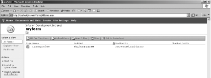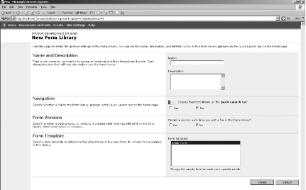 5.3. Form Libraries SharePoint Services forms are graphical representations of an XML schema that can be used to collect or display data. SharePoint Services integrates with compatible XML editors to allow you to create or import forms to be used on your team site. All SharePoint Services forms are stored in a form library. 5.3.1. Creating a Form Library A form library provides you with a logical storage location to manage the forms on your SharePoint site. Figure 5-11 shows the New Form Library page, which is used to create new form libraries on your team site. To create a form library: Click Create on the top menu bar. Click Form Library under Document Libraries. Type the form name in the Name text field. Type a brief description of the form in the Description text field. The Description field is optional. If you want your Form Library to appear in the Quick Launch Library, select the Yes radio button in the Navigation section. If you want to create a backup of your form each time it is checked into the form library, select the Yes radio button in the form versions section. Select the form template you want to use for all the forms in the forms library. Click Create. Figure 5-11. Create a new form library  5.3.2. Creating a Blank Form If there are no form templates available when you create your forms library, by default the form is created as a blank form. To create a blank form template: Click "Modify settings and columns" under the Action section of the page that displays the form library. Click Edit Template in the General Settings sections. To edit the form template, you must have a SharePoint Services-compatible XML editor installed on your computer. 5.3.3. Editing a Form Library's Settings To change the configuration of a form library: Click Documents and Lists on the top menu bar. Click on the form library you want to open. Click "Modify settings and columns." Click "Change general settings." Edit the existing settings. 5.3.4. Adding a Form to a Form Library There are two ways to add a form to a form library. You can fill out a blank form that is based on your form template or upload an existing form from your computer. 5.3.4.1 Filling out a form based on an existing template To fill out a form based on your form template: Click Documents and Lists on the top menu bar. Click on the form library you want to open. Click Fill Out This Form. After you click the link, the form opens in the program in which the form was created. Fill out the form. Click Save and Close. 5.3.4.2 Filling out a form based on a blank for template If you try to fill out a form that uses the blank form template, you will receive an error message because the form doesn't exist yet. You must first create the form using InfoPath. To create a form from the blank form template: Click Documents and Lists on the top menu bar. Click on the myFormLibrary form library. Click Fill Out This Form. At this point, you will see an error message when InfoPath opens. The form doesn't exist yet, but InfoPath is trying to let you enter data. To fill out a blank form, you must: Leave InfoPath 2003 open. Select File Design a Form Click New Blank Form on the righthand menu. Type What is your name? into the top left of your form. Click Controls. Drag a Text Box and a Button onto your page. Click Save. Click Publish. Click Next. Select the "To a SharePoint form library" radio button. Click Next. Select the "Modify an existing form library" radio button. Click Next. Enter the following URL: http://localhost/default.aspx. Click Next. Select your form library from the drop-down list. Click Next. Click "Override the existing form template in this form library" radio button. Click Next. Click Finish. Select the "Open this form from its published location" checkbox. Click Close. The form library opens on your Team Site. Click Fill Out This Form. 5.3.4.3 Uploading an existing form To upload a form to the form library: Click Documents and Lists on the top menu bar. Click on the form library you want to open. Click Upload Form. Click the Browse button and navigate to the form you want to upload. Click Open. 5.3.5. Editing a Form Template If the form library is configured to allow you to edit the form template, you can add, delete, or modify form columns directly through a web browser. To edit a form template: Click Documents and Lists on the top menu bar. Click on the form library you want to open. Click "Modify settings and columns." Figure 5-12 shows the form library maintenance page. You can edit existing forms, upload and view new forms, or create alerts on the form library maintenance page. Figure 5-12. Form library maintenance page  5.3.5.1 Adding a column to a form template To add a column to a form: Click "Add a new column" in the Columns section. Type a name for the column in the Column name text field. Select the type of information you want the column to display from the Information Type list. Customize the settings of your column. Click OK. 5.3.5.2 Editing a column on a form To edit a column on a form: Click on the column you want to edit in the Columns section. Edit the sections you want to change. Click OK. 5.3.5.3 Deleting a column from a form To delete a column from a form: Click on the column you want to delete in the Columns section. Click Delete. 5.3.6. Deleting a Form Library To delete a form library from your SharePoint Services Team site: Click Documents and Lists on the top menu bar. Click on the form library you want to delete. Click "Modify settings and columns." Click "Delete this form library."