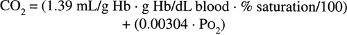 Using a normal hemoglobin value of 15 g/dL, an arterial saturation of 97% and a mixed venous saturation of 75% gives approximate oxygen content values of 20 and 15 mL/dL, respectively, and an arterial venous oxygen difference of 5 mL/dL. Once arterial saturation has reached 100%, increasing the inspired Po2 will not result in any significant increase in oxygen content. Only with hyperbaric oxygen administration can dissolved oxygen be increased to significant levels.