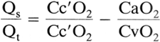 where Qs/Qt is the fraction of cardiac output that is shunted and Cc o2 is the oxygen content of capillary blood exiting from an ideal alveolus. Thus, to solve the shunt equation, one needs to know the arterial and mixed venous Po2, the ideal alveolar Po2 (from the arterial Pco2 and the alveolar gas equation), and the corresponding hemoglobin saturations in order to calculate oxygen contents. Normal Qs/Qt is less than 5% but can increase to greater than 50% in patients with acute respiratory failure. Note that Qs/Qt is a reflection of all units with [V with dot above]/[Q with dot above] ratios that are less than the ideal alveolus but not necessarily equal to zero (true shunt). In this regard, it is more accurate to refer to Qs/Qt as a measurement of overall venous admixture.