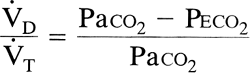 where [V with dot above]D/[V with dot above]T is the fraction of total ventilation that is wasted and Peco2 is the mixed expiratory Pco2. This last variable includes both alveolar gas and anatomic dead space gas and should not be confused with end-tidal (end-expiratory) Pco2, which is an index of alveolar gas only. [V with dot above]d/[V with dot above]t is considered a measure of overall wasted ventilation because it reflects all units with [V with dot above]/[Q with dot above] ratios greater than the ideal alveolus as well as the true dead space. Physiologic dead space greater than 65% is associated with respiratory failure.