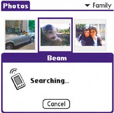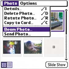 | From either the thumbnail view or the list view, select the photo you want to beam. Use the navigator, since tapping a photo will open it. Select Menu > Photos > Beam Photo.