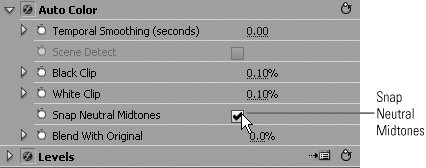 | 6. | Select the Snap Neutral Midtones checkbox. If this doesn't produce the desired quality, delete the effect by right-clicking the effect and choosing Clear. Then move to #26. If the results are acceptable, continue to step 7.