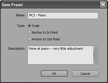 | | | 3. | Name the preset, and if desired, enter a description and click OK (Figure 32a). If your effect has keyframes, choose whether you want them scaled over the duration of the target video, or anchored to the In or Out Point.