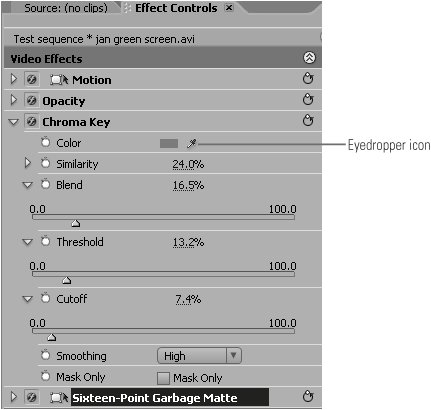 Figure 48a. The business end of the Chroma Key filter.  Note When you hold down the Ctrl key, Premiere Pro samples an area of 5x5 pixels, further averaging the color values.