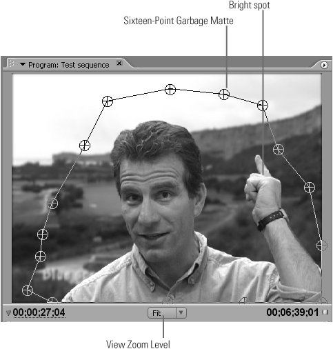 | 8. | If the edges around the video frame are a problem, consider applying a Garbage Matte (Video Effects > Keying Folder), which eliminates any pixels outside the matte. In Figure 48b, you can see the Sixteen-Point Garbage Matte surrounding the speaker. Simply grab each positioning handle and move it inward to hide the edge residue. Be sure that arm, head, or other motions don't extend beyond the matte; otherwise, they will be excluded as well.