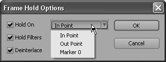 | 5. | In the Frame Hold Options dialog, select all the checkboxes, and choose In Point in the drop-down menu (Figure 70c).