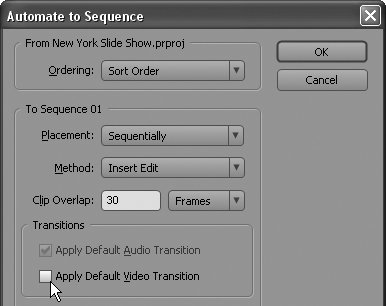 Figure 71b. You can set the clip overlap (in frames) here, and choose whether or not to apply the Default Video transition.  Watch for Flicker When you apply pan-and-zoom effects to still images with lots of fine detail, you may see flicker or shimmering in the video Premiere Pro produces. If so, right-click the image and choose Field Options to open that dialog box. Then choose Flicker Removal in that dialog box and click OK to close it. Flicker removal blurs the image slightly, but should reduce or eliminate the flicker. If this doesn't work, or if the image is too blurry, try clicking Always Deinterlace in the Field Options dialog box then click OK to close it. For more details on deinterlacing, see #83. |