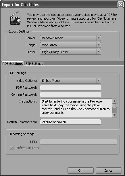 Note The text in the Instructions box pops up when the reviewer opens the PDF File. The default text Adobe provides includes useful information for first-time users, so you should consider using the default text with minimal modification the first few times you send Clip Notes to a new reviewer. Return Comments toIf desired, type an email address in the Return Comments to text box. If you enter an address, Acrobat will automatically create an email message to that email address, and attach the comments file, when the reviewer exports his or her comments. Click OK, and Premiere Pro will open a new dialog box, where you can choose a name and storage location for the PDF file. Click Save in that dialog box, and Premiere Pro will start producing the video and PDF files. Consider Optical Media For reviewing an entire production, consider sending your Clip Notes via optical media like CD or DVD. Choose the Embed Video option (Figure 78a), and burn the PDF file created by Premiere Pro to CD or DVD using any recording program. Send it to the reviewer, who can enter comments and store the XFDF file on his or her hard drive for returning to the producer. |