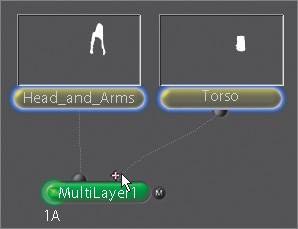 28. | Drag the outputs of the Torso, Left_Leg, and Right_Leg nodes to the plus sign (+) on the top of the MultiLayer1 node that appears when the cursor passes over it.