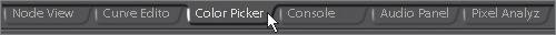 The Color Picker, which is in a tab on the Node workspace, allows you to sample values from the Viewer, and then drag and drop them onto other parameters. It includes handy analysis tools for finding and comparing different color values on your image. You can examine minimum, average, current, and maximum pixel values, which is particularly useful, naturally, when doing color corrections.