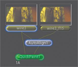 | 18. | Connect the wire3 image to the first input of a QuickPaint node, and the output from the AutoAlign1 node to the second input.
