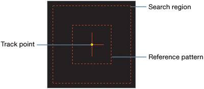 Positioning the Tracker By default, the tracker appears in the Viewer. Each tracker has a reference pattern, search region, and track point.  Reference pattern The inner box is the reference pattern. It defines a small pattern that the tracker will search for in subsequent frames. It's always a good idea to choose a region with good contrast and detail. A corner with sharp contrast is usually a good area to track, because motion can be detected easily in any direction. The reference pattern can be scaled to the desired size. Search region The outer box is the search region, which should be the maximum amount your track point will move between frames. The larger it is, the slower the tracker is. The search region can be sized in the same fashion as the reference pattern. Track point The crosshairs constitute the track point, which represents the position of the motion track. Normally, the track point is at the center of the tracker, but it can be offset if the reference pattern becomes obscured. Pick a Good Reference Pattern The ideal reference pattern is one that doesn't change perspective, scale, or rotation, and does not go offscreen or get obscured by other objects. It also doesn't change overall brightness or color, has a very high contrast, and is distinct from other patterns in the same neighborhood. Meanwhile, in the real world, you have to contend with all of these factors, which will cause your trackers to lose accuracy. A successful composite requires an accurate track. 1. | Make sure that you are positioned at frame 1 of the timeline.