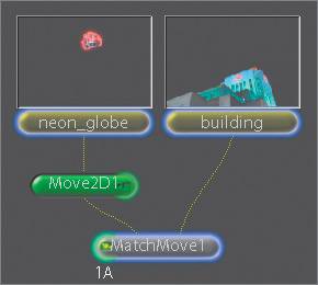 | Apply a Tracking Curve In this case, the default settings in MatchMove for applying the curve are already set the way you want, with the exception of applyTransform. Remember, there are always exceptions. For different types of match-moving, you may want to change some of these settings: trackType Allows you to choose what track type you want, either one-point(panning), which is the default; two-point (panning, scaling, and/or rotation); or four-point (corner-pinning).  applyX/applyY For panning, you can select applyX or applyY separately, or you can select both. Both are on by default. applyScale and applyRotate will show up in the menu only if 2 pt is selected.  applyTransform The applyTransform function applies the transform needed to stabilize the image. It is inactive by default. You will need to turn it on for this project. Now let's apply the tracking curve. 1. | Connect the output of the neon_globe node to the foreground or first input of MatchMove1.