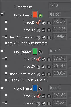 | Averaging Tracks A common technique is to track forward from the first frame to the last, and then create a second track, tracking backward from the last frame to the first. It just so happens that you have already done this. What a coincidence! These two tracks are then averaged together to hopefully derive a more accurate track. Because MatchMove always uses track1 for x-y transformations, you will need to copy track1 to a different track before averaging. 1. | At the bottom of the Parameters workspace, right-click track3 and choose Load Track.