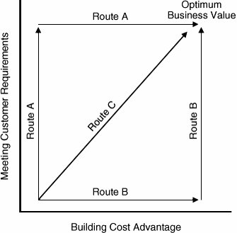 The Japanese miracle: We have witnessed the emergence of Japan as a major industrial power following the devastation of World War II. It is better understood now how Japanese corporations such as Toyota, Honda, and Sony have deployed Total Quality Management (TQM), Lean Production, and Taguchi Methods to gain quality and cost advantages. Congruence with the CEO's concerns: Management practices in the West have gradually adopted TQM and Lean Production systems. For example, Six Sigma, a variant of TQM, places much more emphasis on the bottom line and measurable short-term results on a project-by-project basis than the traditional TQM that has been practiced in Japan. A major factor in Six Sigma's attractiveness in the West is its record of delivering short- as well as long-term bottom-line improvements. The CEOs in the West can hardly ignore the stock market's short-term expectations. Jack Welch describes this challenge succinctly: "The only reason anyone has the title of manager is to manage short and long. ... Anybody can manage short. All you do is go in and for two years squeeze everything and look like a hero. Anybody can also manage for the long term, go in and say I'm going to deliver in 1995 and don't bother me until then. The hard game is balancing it."[2] Customer expectations: Customers in any industry can hardly be satisfied with offerings based on cost or quality alone. They ask for both. This doesn't mean that the product has to be all things to all people; it implies understanding the customer's cost and quality requirements and responding intelligently to those requirements. Competitive advantage: Even though a quality product can command a premium price, a cost advantage provides competitive cover, better margin, or both. In software development, the right strategy is to design software such that it optimizes both the customer's trustworthiness requirements (quality) and the software developer's cost requirements (Route C in Figure 4.1). For example, DFTS provides a systematic methodology to optimize various requirements at the lowest cost. In the absence of such a development model, software developers try to fulfill customer requirements first and then attempt to lower development costs (Route A) or, worse still, develop at a low cost first and then seek to meet customer requirements (Route B). Both these approaches are difficult to pursue and fail to deliver trustworthy software at the lowest cost. So here is the amazing revelation: Find a way to deliver as per the customer requirements, or it will cost you more! Figure 4.1. Alternative Routes to Creating Optimum Business Value  |