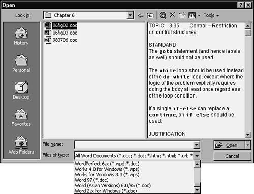 | The sharing of data among applications is what really gives software its power. A well-written program that supports and adheres to published standards and allows users to easily transfer data to and from other software is a great compatible product. The most familiar means of transferring data from one program to another is saving and loading disk files. As discussed in the previous section, adhering to the low-level standards for the disk and file formats is what makes this sharing possible. Other means, though, are sometimes taken for granted but still need to be tested for compatibility. Here are a few examples: File save and file load are the data-sharing methods that everyone is aware of. You save your data to a floppy disk (or some other means of magnetic or optical storage) and then hand carry it over to another computer running different software and load it in. The data format of the files needs to meet standards for it to be compatible on both computers. File export and file import are the means that many programs use to be compatible with older versions of themselves and with other programs. Figure 9.6 shows the Microsoft Word File Open dialog box and some of the 23 different file formats that can be imported into the word processor. Figure 9.6. Microsoft Word can import 23 different file formats.