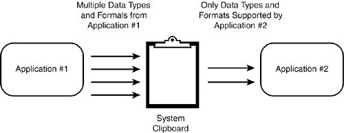 To test the file import feature, you would need to create test documents in each compatible file formatprobably using the original software that wrote that format. Those documents would need to have equivalence partitioned samples of the possible text and formatting to check that the importing code properly converts it to the new format. Cut, copy, and paste are the most familiar methods for sharing data among programs without transferring the data to a disk. In this case, the transfer happens in memory through an intermediate program called the Clipboard. Figure 9.7 shows how this transfer occurs. Figure 9.7. The System Clipboard is a temporary holding place for different types of data that's being copied from one application to another.