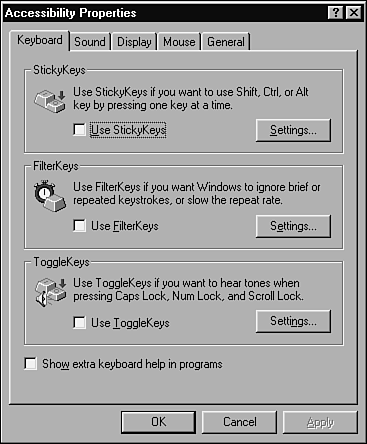 Cutting the data another way, reveals that 7.7 million people have difficulty seeing the words and letters in a newspaper. 1.8 million people are legally blind and 8 million people have difficulty hearing. With our aging population and the penetration of technology into nearly every aspect of our lives, the usability of software becomes more important every day. Although there are many types of disabilities, the following ones make using computers and software especially difficult: Visual impairments. Color blindness, extreme near and far sightedness, tunnel vision, dim vision, blurry vision, and cataracts are examples of visual limitations. People with one or more of these would have their own unique difficulty in using software. Think about trying to see where the mouse pointer is located or where text or small graphics appear onscreen. What if you couldn't see the screen at all? Hearing impairments. Someone may be partially or completely deaf, have problems hearing certain frequencies, or picking a specific sound out of background noise. Such a person may not be able to hear the sounds or voices that accompany an onscreen video, audible help, or system alerts. Motion impairments. Disease or injury can cause a person to lose fine, gross, or total motor control of his hands or arms. It may be difficult or impossible for some people to properly use a keyboard or a mouse. For example, they may not be able to press more than one key at a time or may find it impossible to press a key only once. Accurately moving a mouse may not be possible. Cognitive and language. Dyslexia and memory problems may make it difficult for someone to use complex user interfaces. Think of the issues outlined previously in this chapter and how they might impact a person with cognitive and language difficulties. Legal Requirements Fortunately, developing software with a user interface that can be used by the disabled isn't just a good idea, a guideline, or a standardit's often the law. In the United States, three laws apply to this area and other countries are considering and adopting similar laws: The Americans with Disability Act states that businesses with 15 or mores employees must make reasonable accommodations for employees, or potential employees, with disabilities. The ADA has recently been applied to commercial Internet websites, mandating that they be made accessible to the public who uses them. Section 508 of the Rehabilitation Act is very similar to the ADA and applies to any organization that receives federal funding. Section 255 of the Telecommunications Act requires that all hardware and software that transfers information over the Internet, a network, or the phone lines be made so that it can be used by people with disabilities. If it's not directly usable, it must be compatible (see Chapter 8, "Configuration Testing," and Chapter 9, "Compatibility Testing") with existing hardware and software accessibility aids. Accessibility Features in Software Software can be made accessible in one of two ways. The easiest is to take advantage of support built into its platform or operating system. Windows, Mac OS, Java, and Linux all support accessibility to some degree. Your software only needs to adhere to the platform's standards for communicating with the keyboard, mouse, sound card, and monitor to be accessibility enabled. Figure 11.7 shows an example of the Windows accessibility settings control panel. Figure 11.7. The Windows accessibility features are set from this control panel.