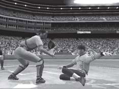 The “Jumbotron” screen depicts batting and running players as a screen within a screen action. Other detailed graphic features include dust clouds when a player slides into a base or off the player’s cleats when the bat taps the footwear before entering the batter’s box. Even the clouds across the sky or the orange-red sunset shows the graphic detail achievements. Players have facial animations and realistic expressions. The ball in motion has a slight comet-tail visual showing a fast moving ball. Broadcast-quality camera angles and perspectives with zooming and panning are so seamless you begin to think that a cameraman is controlling the viewing. Numerous home run animations depict visuals like a swing from four different angles, instant replay montages, and animations where the ball flies out of the stadium while another one shows the ball’s flight from its POV.