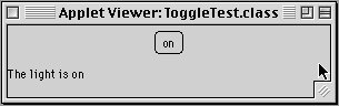 import java.applet.*; import java.awt.*; import java.awt.event.*; import javax.swing.*; public class ToggleApplet extends JApplet implements ActionListener { private ToggleButton lightSwitch; public void init() { lightSwitch = new ToggleButton ("off","on"); getContentPane().add(lightSwitch); lightSwitch.addActionListener(this); } // init() public void actionPerformed(ActionEvent e) { showStatus("The light is " + lightSwitch.getText()); } // actionPerformed() } // ToggleApplet class |