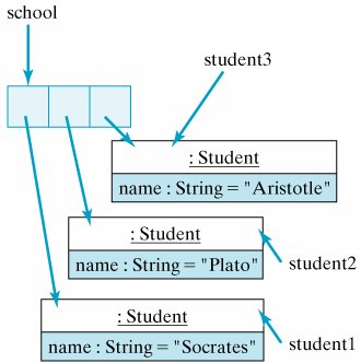 Student student1 = new Student("Socrates"); Student student2 = new Student("Plato"); Student student3 = new Student("Aristotle"); Student school = new Student[3]; // A 3 Student array school[0] = student1; school[1] = student2; school[2] = student3;