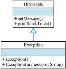 The java.lang.Exception class itself is very simple, consisting of just two constructor methods (Fig. 10.5). The THRowable class, from which Exception is derived, is the root class of Java's exception and error hierarchy. It contains definitions for the getMessage() and printStackTrace() methods, which are two methods that we will use frequently in our error-handling routines.